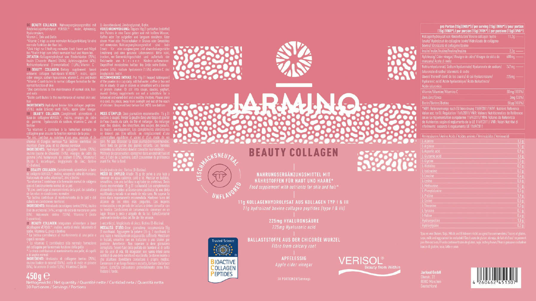 JARMINO Beauty Collagen (450g, 30 Portionen) mit Kollagenhydrolysat VERISOL® und Hyaluronsäure Unsere einzigartige Formel aus Kollagenhydrolysat VERISOL® (Kollagenpeptide, < 2 kDA) Typ I und III, Hyaluronsäure, dem Ballaststoff Inulin aus der Chicorée Wurzel, natürlichem Apfelessig, Vitamin C, Biotin (Vitamin B7) und Zink versorgt Ihre Haut, Haare und Nägel* mit vielen wichtigen Nährstoffen. *Biotin trägt zum Erhalt normaler Haut und Haare bei. Beste Qualität